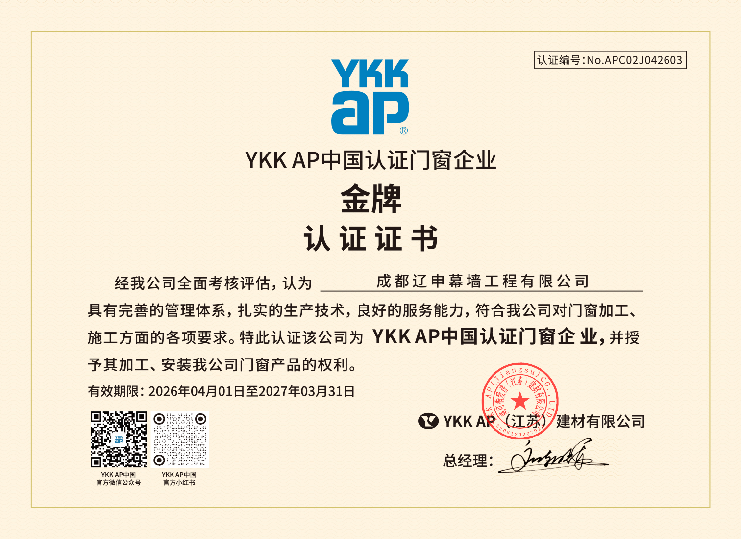 铝合金门窗 成都 成都辽申幕墙工程有限公司 2026/4/1-2027/3/31