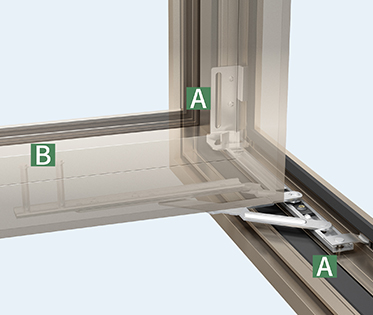 滑撑与外框的连接处,设计了固定拉片A,直接和外框上的型材腔体连接,防止脱落。内扇采用槽口插入式B,滑撑直接插入型材槽口,然后再用铆钉固定,避免使用中发生脱落。