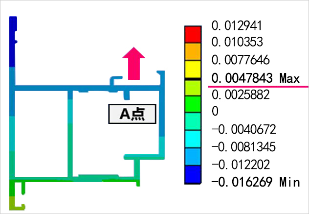 L50BFY-T主型材截面主要受力部位基材壁厚达到1.8mm,在A点施加作用力,型材基本保持蓝绿色(意味着型材未产生较大的变形量)。型材强度得到有效提高,可满足华南地区高层住宅的抗风压设计要求。