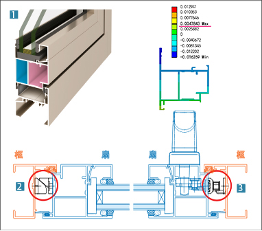 由腔体强度设计1带来门窗整体的强度提升,从根本上提高了门窗的抗风压性能;锁紧块的设计2,加强了扇与框的锁紧,为门窗提供良好的强度支持;外平开窗最多设置3个锁点3,充分确保执手侧强度,保证良好的抗风压性能。