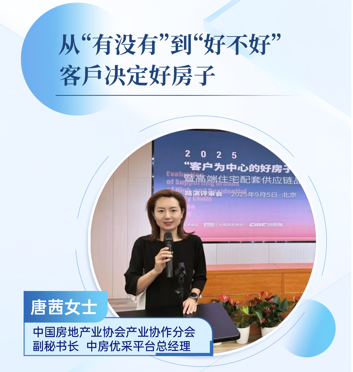 9月5日,在中国房地产业协会指导下,由中房优采联合克而瑞共同主办的“客户为中心的好房子”研讨会暨2025高端住宅配套供应链品牌测评研究路演评审会,于北京盛大启幕。