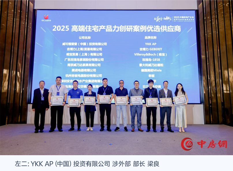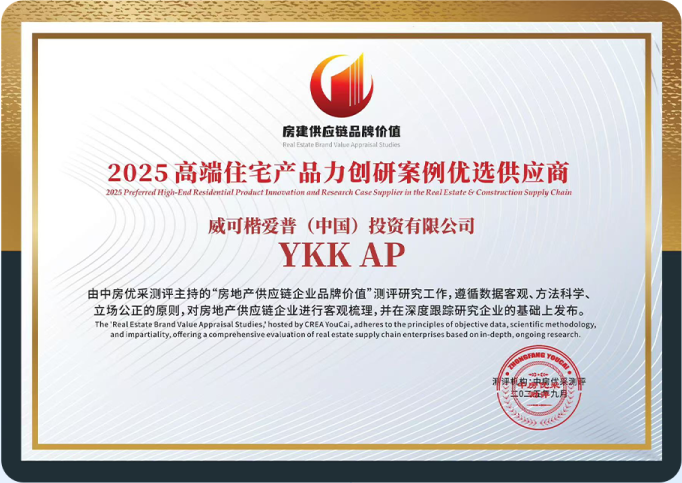 在这份报告的严格评选中,YKK AP依托扎实的产品品质、深厚的行业积淀、稳定的合作口碑及项目落地能力等多个维度的核心优势,荣获“2025高端住宅产品力创研案例优选供应商” 称号。
